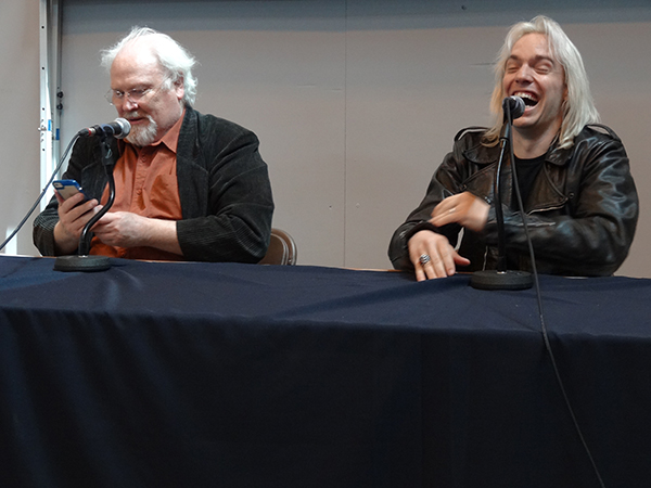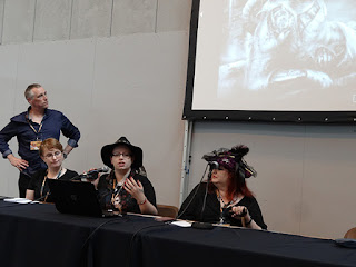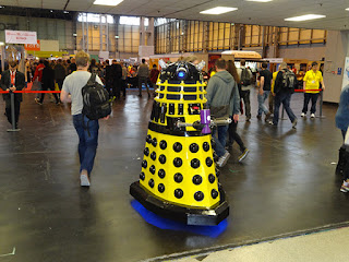 So we've had lots of photos. Time for a couple of videos. I must apologise in advance for the sound hiss from the crowd outside the seminar area. Its only a little camera! First up is the resolution of a tied Dr Who quiz via an arm wrestling contest. Then we have the interview of Colin Baker by comedian John Robertson. I got most of it but my camera kind of run out of memory. So excuse the schoolboy error, I wasn't planning to do video this year.